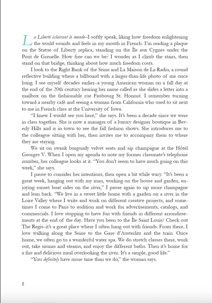 A peek at pages 2 and 3. Imagine me reading these pages in the wee hours in early May at a European Writers’ party in Madrid while accompanied on guitar with French street music. It was the first time I read the book aloud to an audience and it was a joy.