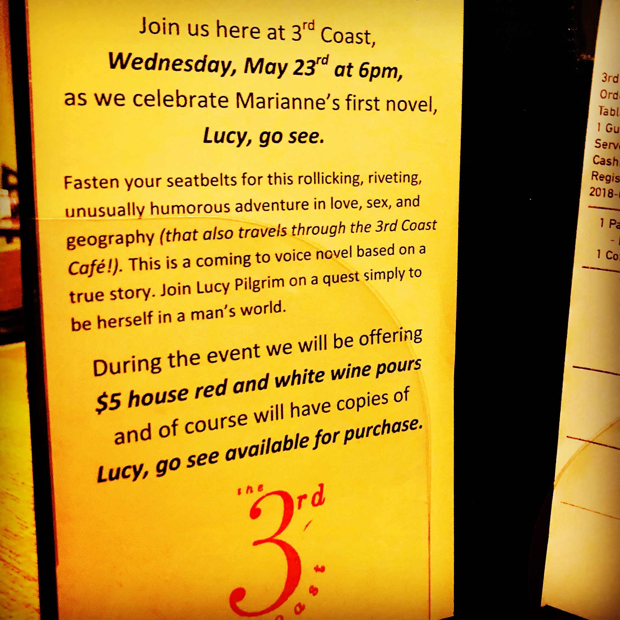When I moved to Chicago in 2017, after decades away, I hung out in the 3rd Coast Café, as I used to, and as Lucy Pilgrim does in the novel. I moved into an apartment in the building, did a reading of the novel in the café, and wrote a great deal of the second novel, Lucy, come home., there. One Sunday afternoon, a beautiful lively art student, Carina Clark Reimers, flashed in and sat down next to me on her break from working as a hostess at a nearby restaurant. “So, I remind you of you twenty years ago?” she asked after we chatted a while. I thought, sure, let’s say twenty. She reminded me most of all of Lucy. We enjoyed each other’s company during our time in Chicago (she graduated from The Art Institute and is back in her hometown of Los Angeles). One winter evening when she stopped in the Coast, and saw me playing with drawings and cover ideas, she asked if she could help. A few weeks and idea exchanges later, we created this wonderful cover.
