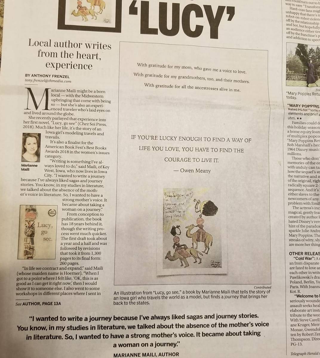 p1080253.jpgIf you wish to buy or offer a book that’s thought-provoking and absolutely ‘unputdownable’, Lucy, go see. is what you’re looking for. When we think of international models we can’t help bringing to mind the usual clichés. However, in Lucy, go see., we are confronted with a funny, philosophical, curious, beautiful woman who explodes most of those preconceived ideas. As we read, Lucy develops into a woman who resists dehumanizing, and being dehumanized  with every bone in her body, in a business world where she is viewed as a commodity, and where back at home in Iowa she is perceived if not exactly as the black sheep, definitely as a multicolored, un-herdable one. People persist in trying to categorize Lucy’s body and mind, and lucky for her that somewhere deep down she manages, against the odds, to retain the knowledge that both are sound. However, when she listens to people around her, they question both, and ‘helpful’ suggestions of lithium and starvation are thrown in her direction. The very essence of Lucy seems to be more at home in nature, than under layers of make-up and crimped hair, but although her Iowa countryside feeds her, she also needs to see a bigger, wider world, and modeling is her ticket out. The reader imbibes her word-painted auto-portrait and is as confused as she when hairdressers, make-up artists and stylists don’t seem to understand the canvas and insist on transmogrifying her beauty into a cheaper, brassier version. Through Lucy’s visits to international modeling agencies, and meetings with top executives and bookers, we get a grasp of how models have to start out on their career with a strong self-image, and fight tooth and nail to maintain it, and understand how they could be easily pushed on a downward spiral of eating disorders and low self-esteem if they don’t have a good spring to their internal resistance. Lucy’s metaphysical questions are not only confined to the city and her jet set career, she also has to deal with advances from her paternal grandfather in an extremely patriarchal mid-western family back in Iowa. She tackles the problem with honesty and integrity and fast fledging courage, ruffling others’ feathers on the way. With her new unfaithful wife and divorcée status, she also has to justify her own right to speak out against being harmed. The treatment of the complex, taboo situation is thorough as Lucy fights to protect herself mentally and physically, and tries to rescue her own pure love for her grandfather from the complex backdrop of a widower’s loneliness and feistiness that took a very wrong turn. Romantic love is not missing from the book and the reader is as fixated and as frustrated as Lucy by the handsome and enigmatic Julien who like Lucy is very different from any stereotypical model. While making love with Julien Lucy has beautiful visions and shortly after they become lovers, Lucy like Saint Teresa, experiences ‘ecstasy’, (as depicted by the artist Bernini in The Ecstasy of Saint Teresa and not in tablet form!). By the end of the book we feel slightly sorry for the male model agency executives, her family and her ex-husband’s belief that they could categorize Lucy and clip her wings. This strong, shamanic, inspiring woman was way out of their orbit. Lucy, go see. is one of the most enjoyable and inspirational books, for anyone, but particularly for women, who may want to also find the courage to go see for themselves… I can’t wait to see what’s in store for Lucy and hopefully Marianne Maili the author will publish a sequel quickly. We sense that the book may be more than somewhat autobiographical and would also like to discover more about Marianne herself…