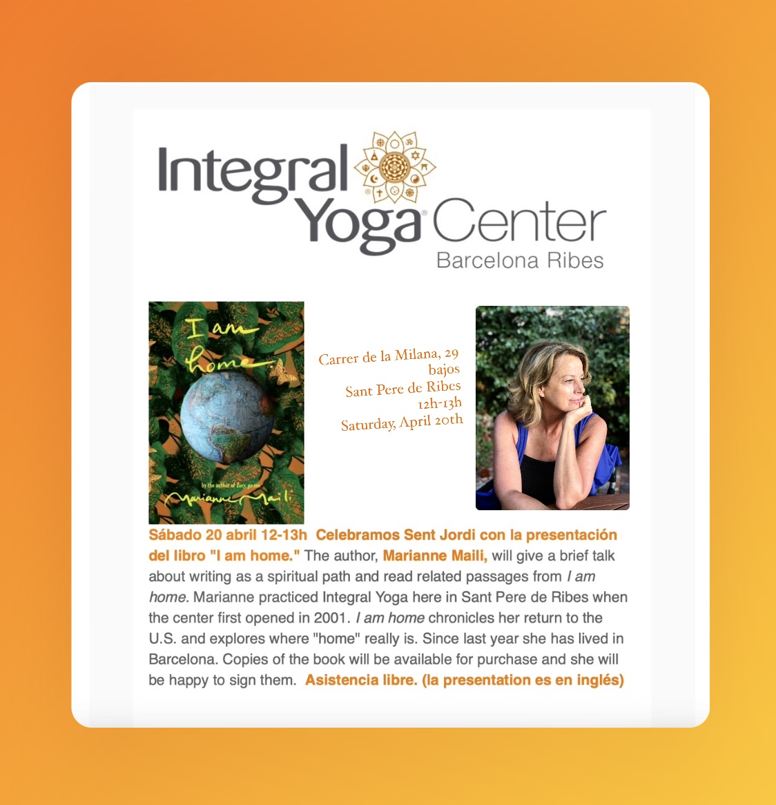 I am looking forward to this hour on this coming Saturday at noon to join in the celebration. If you know folks in the Garraf district of Barcelona who are interested in writing as a spiritual path and the search for home, and who like to read in English, would you please tell them about this gathering on Saturday in this special place which is an oasis?